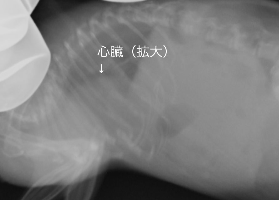正常画像と比べ明らかに心臓が拡大しているのがわかります。また肺の領域も白く見え肺水腫もしくは胸水の存在が疑われます。